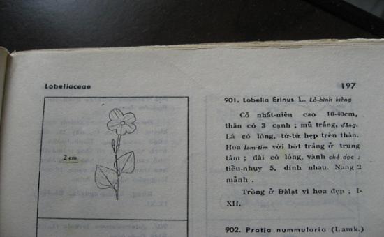 • Ḥa Dalat: Em t́m ra tên Latin cái cây lâu nay người Đà Lạt vẫn gọi nhầm là Forget me not như h́nh trên rồi. Nó là Lỗ B́nh kiểng ( Lobelia Erinus L.) Họ LOBELIACEAE ( Họ Lỗ b́nh ) . Trong sách Thực Vật Chúng của thầy Phạm Hoàng Hộ đó. Sách của em không có h́nh màu nên em chưa dám chắc. • LDĐ: Trên Wikipedia anh thấy h́nh Hoa của Lobelia Erinus L.cũng có màu tím nhưng cánh không đều (2 cánh trên nhỏ, 3 cánh dưới lớn) kiểu h́nh giống hoa lan. Anh sợ không phải. • Ḥa Dalat: Em tin thầy Phạm Hoàng Hộ hơn Wiki. Anh coi cái lá của cây trong Wiki và cái lá của Lỗ B́nh kiểng trong Thực Vật, chúng có giống nhau đâu mà hoa cho giống ? Lại cùng tên latin nữa mới đau cái đầu chứ! • LDĐ: Rất vui là em dẫn anh trở lại thời sinh viên khoa học. Khi học phân loại thực vật với giảng nghiệm viên Hồ Hoành thập niên 60, ḿnh giống như đi vào mê cung tiếng Latin. Những buổi du khảo thú vị cùng các bạn lên đồi núi Thiên An, Ngự B́nh, suối khe chùa Tra Am, nương rẩy các vùng đồi quanh Huế, về biển Thuận An, phá Tam Giang để hái lá hoa cây cỏ về ép trên từng trang giấy khổ lớn, chua thêm tên khoa học tiếng Latin. Hồi trước th́ ḿnh học là giống, loài, bây giờ th́ gọi là chi, loài. Phân loại theo h́nh dáng màu sắc hoa (alba, rosa), h́nh dáng lá (trifolia), vùng sinh trưởng (dalatensis) v.v... Chữ Latin ḿnh chỉ mơ mơ hồ hồ. Hồi trước học như vẹt. Học cây nào biết cây đó, nhớ cây ḿnh thích (Vinca alba, Mimosa pudica...). Thầy Phạm Hoàng Hộ là giáo sư số một về cây cỏ miền Nam rồi, sau này có thêm ông ĐỗTất Lợi cũng giỏi.